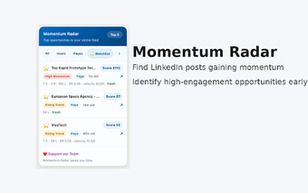 Momentum Radar — это бесплатное расширение для Chrome, созданное для помощи пользователям в выявлении постов с высоким моментом на LinkedIn. Анализируя метрики вовлеченности, оно выделяет посты, которые набирают популярность, позволяя пользователям участвовать в обсуждениях до того, как они достигнут широкой аудитории. Этот инструмент особенно полезен для основателей, создателей, маркетологов и профессионалов в области социального продаж, которые стремятся увеличить свою видимость на платформе.